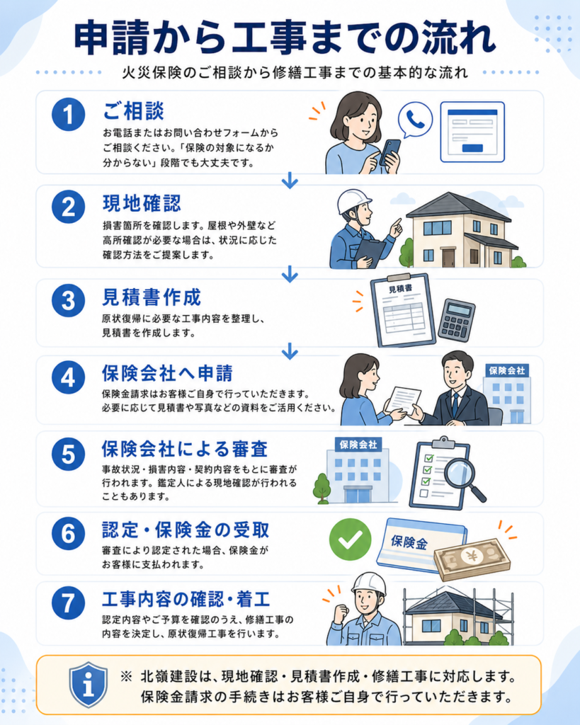 北嶺建設が行うのは、損害箇所の現地確認・原状復帰に必要な工事内容の整理・工事見積書の作成・修繕工事です。保険金の請求手続きは、お客様ご自身で行っていただきます。