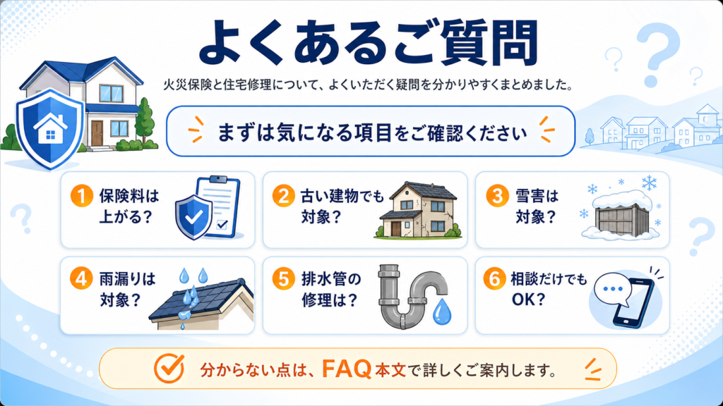A. 一般的に、火災保険には自動車保険のような等級制度はありません。そのため、保険を使ったからといって、すぐに保険料が上がる仕組みではありません。ただし、契約更新時の保険料や条件は、保険会社や契約内容によって異なる場合があります。詳しくは加入している保険会社へご確認ください。