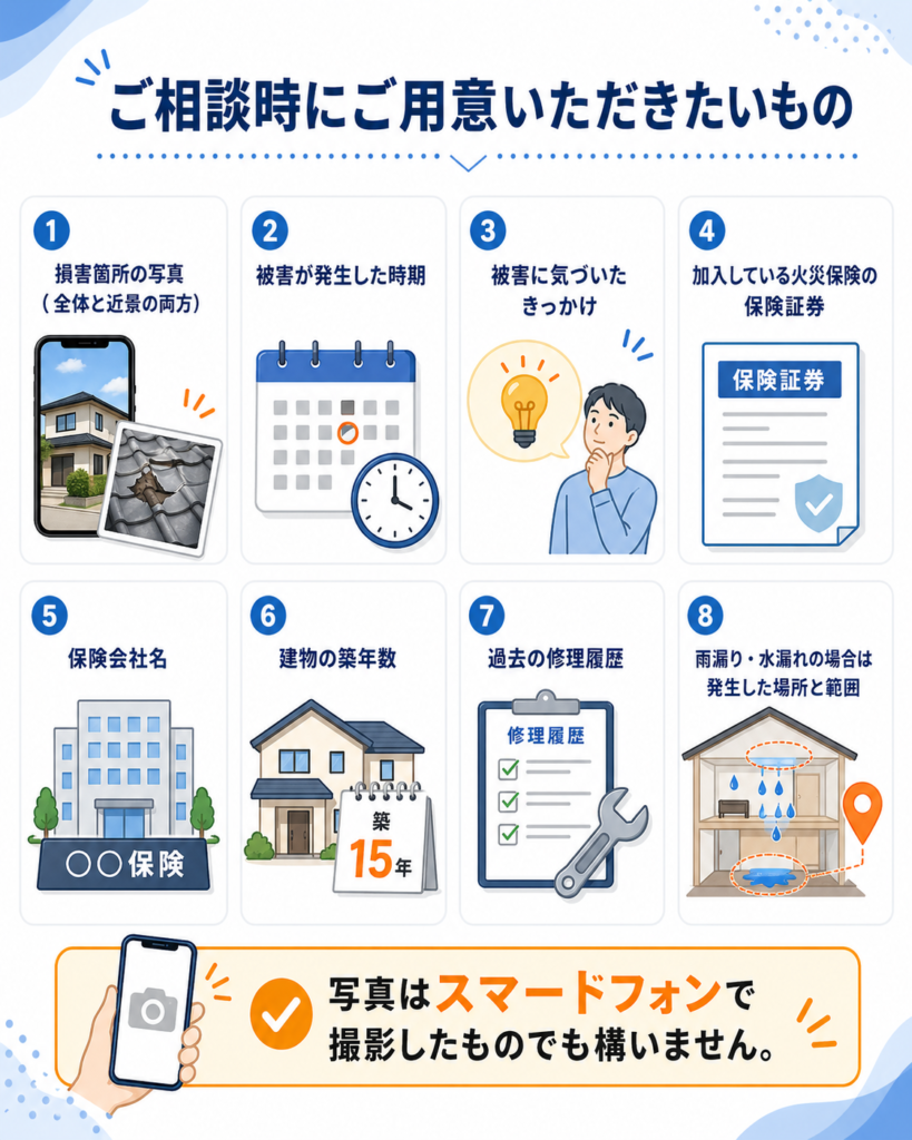 お電話またはお問い合わせフォームからご相談ください。「保険の対象になるか分からない」という段階でも構いません。