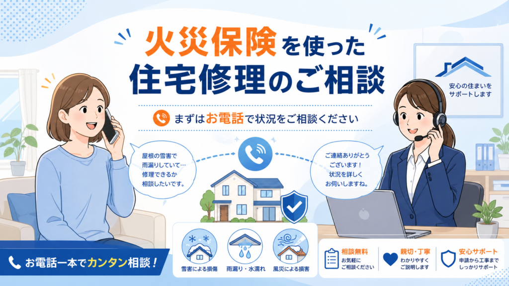 火災保険や賠償保険は、自宅だけでなく、貸家・アパート・テナント物件でも関係することがあります。北嶺建設では、オーナー様や事業者様からのご相談にも対応しています。