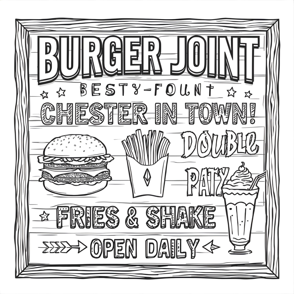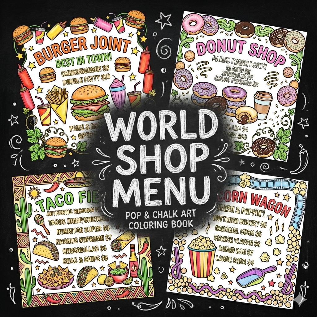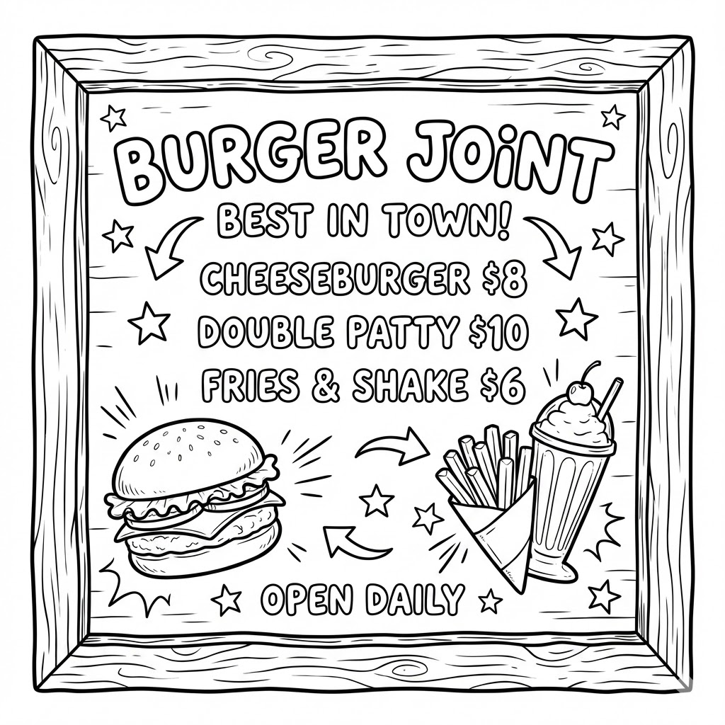 Coloring book page, [shop type] menu board, pop art style, hand-drawn typography,