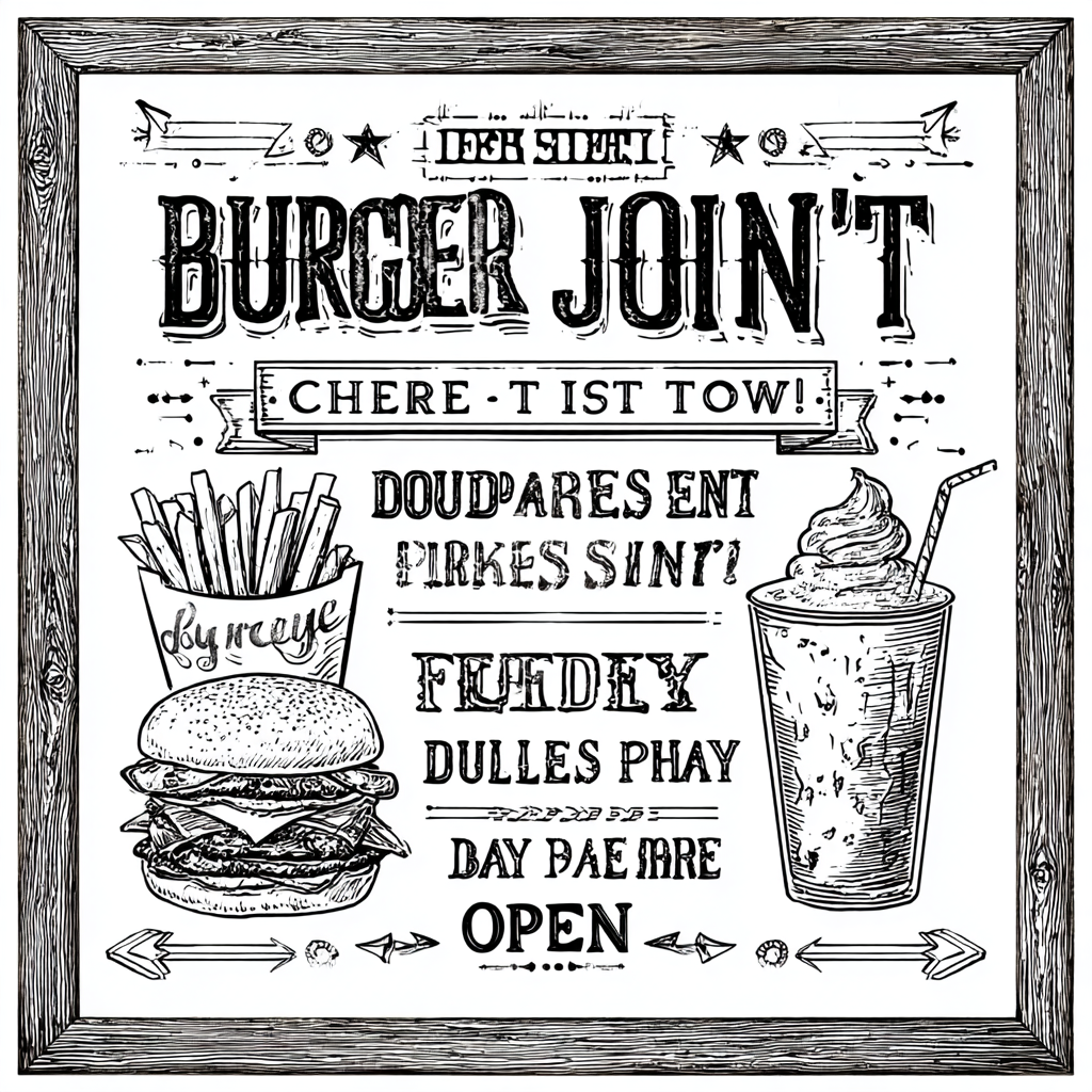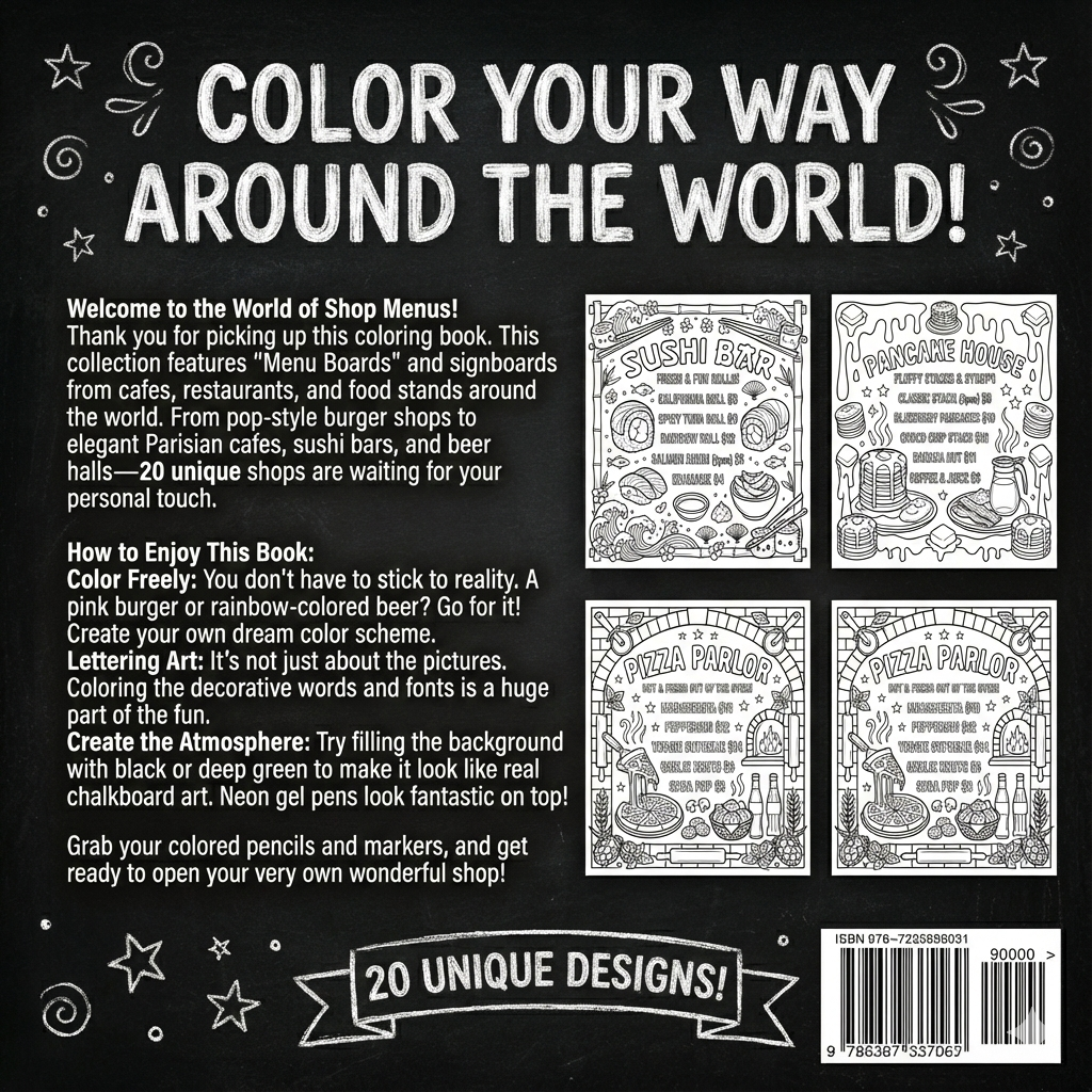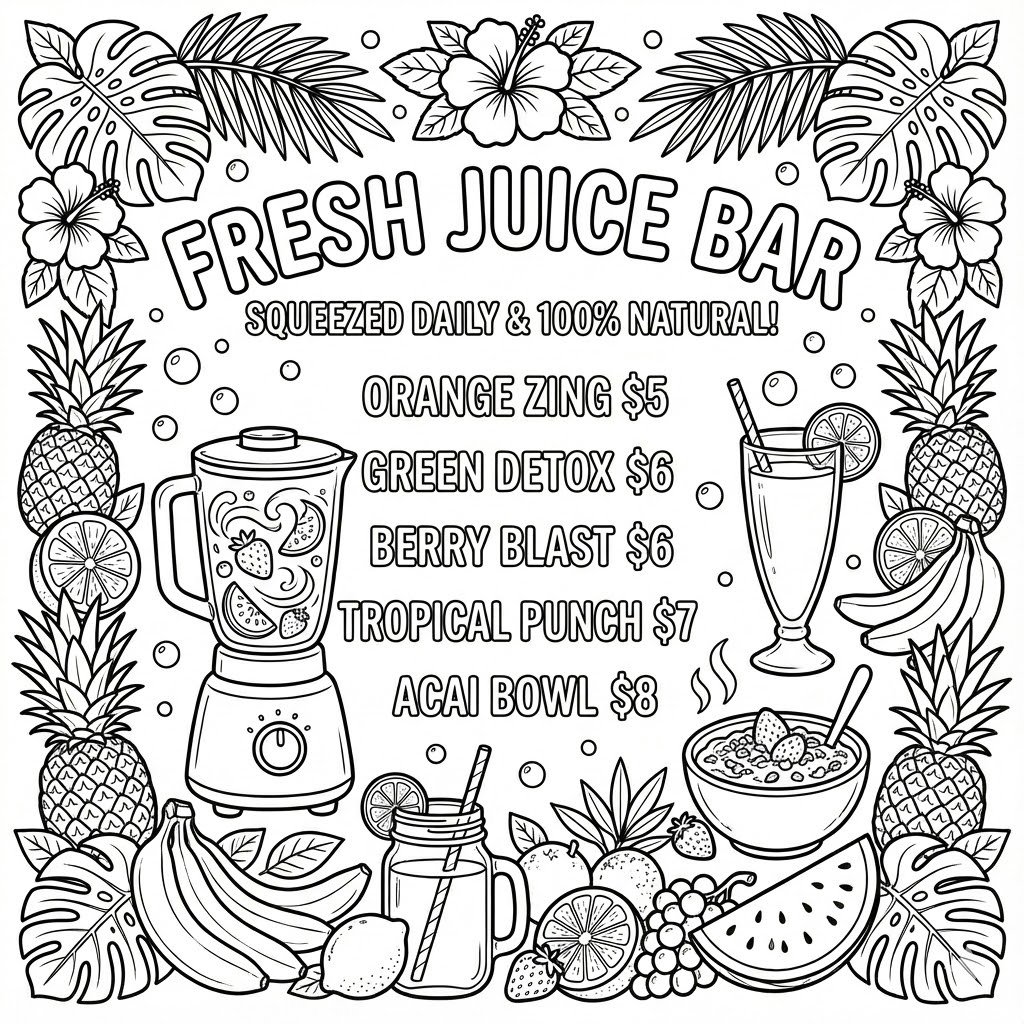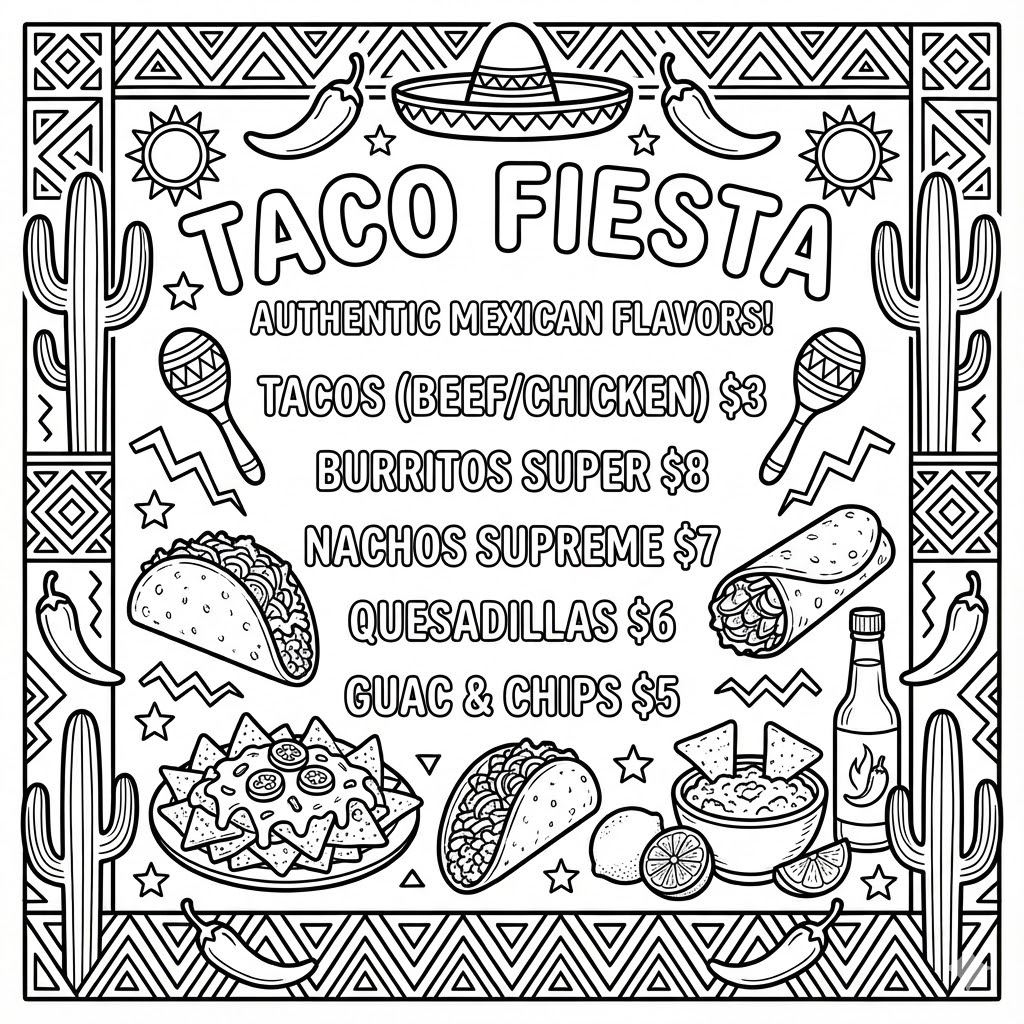 Coloring book page, [shop type] menu board, pop art style, hand-drawn typography,