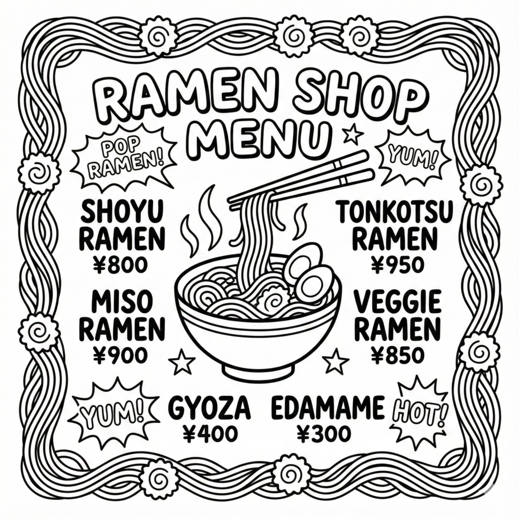 Coloring book page, Ramen shop menu board, pop art style, hand-drawn typography,