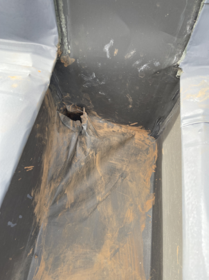 - 雨樋の表面材が劣化のため穴があった