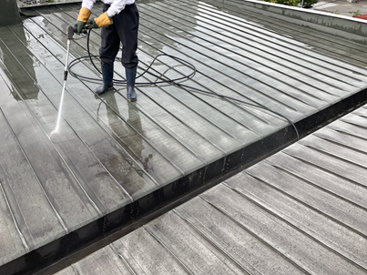 屋根表面の汚れ・苔・古い塗膜をしっかり洗い流します。 - ケレン・錆落とし