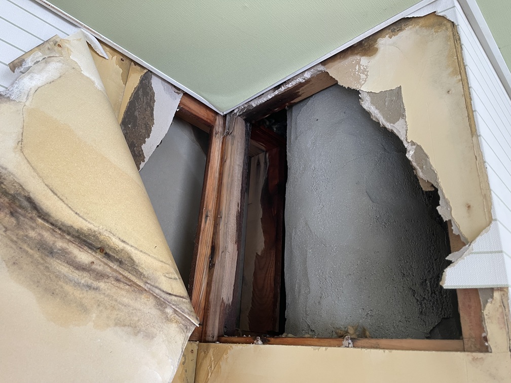 その水が下の部屋まで回り、壁に被害が出ていました。