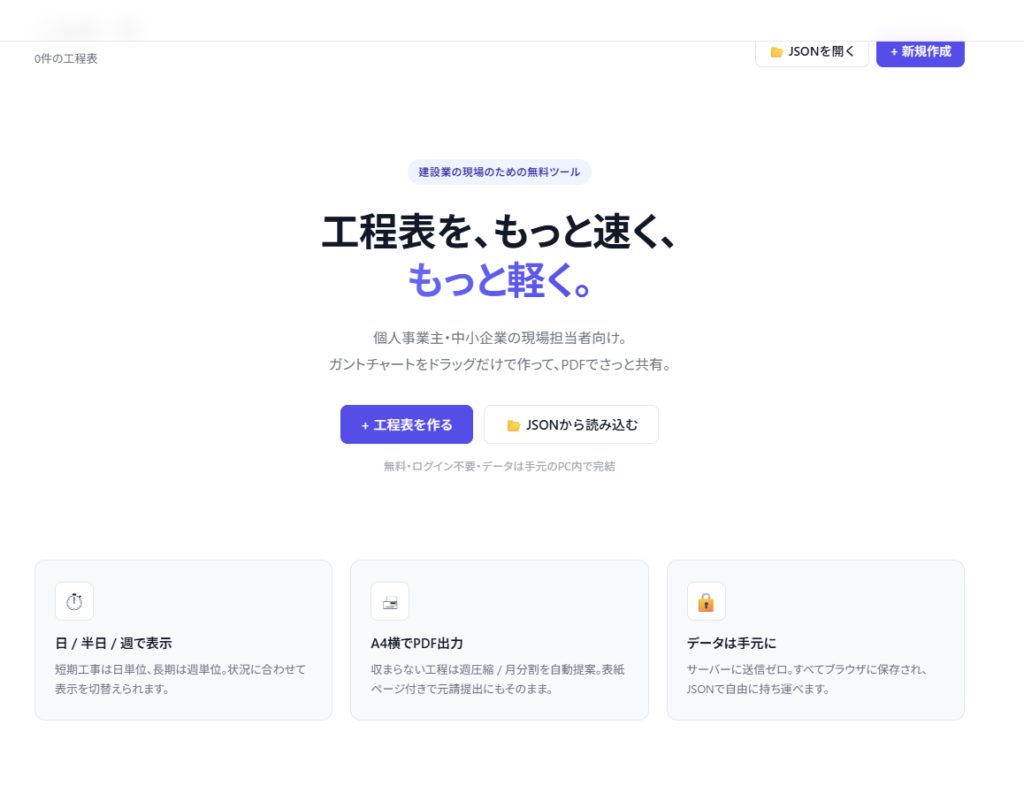 ブラウザで開くだけ・ログイン不要・無料で使えます。現場監督の方にも、一人親方の方にも、気軽に使っていただける設計になっています。