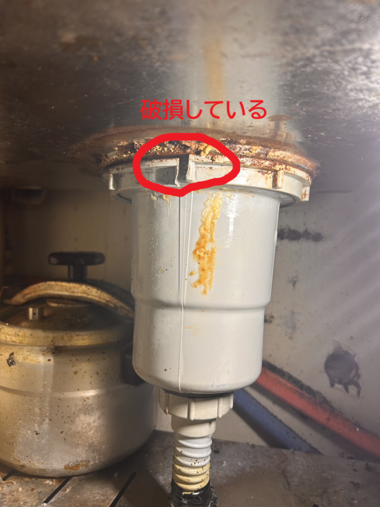 排水トラップの継ぎ目部分が破損しており、