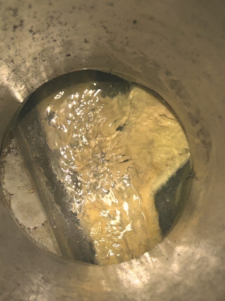現場を確認すると、屋外の排水マスには長年蓄積された油汚れが堆積していました。写真の通り、排水管の出口やマス全体に茶色く分厚い油の塊がびっしりとこびりつき、水の流れを物理的に妨げている状態でした。