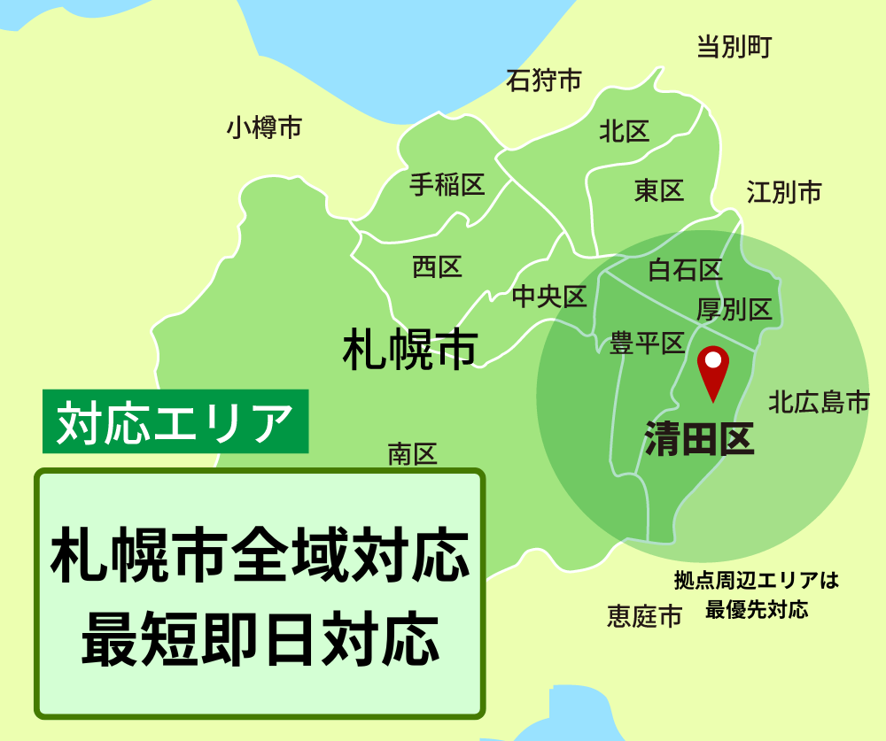 札幌市全域 清田区・厚別区・白石区・豊平区・南区・北区・東区・西区・手稲区・中央区や北広島市の一部