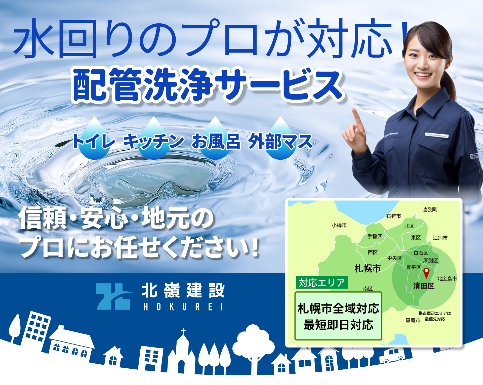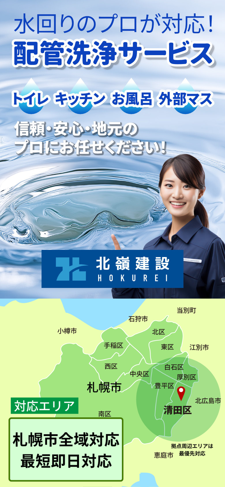 札幌市・清田区の排水管洗浄サービス北嶺建設です。対応地域:清田区・厚別区・白石区・豊平区・南区・北区・西区・東区・手稲区・中央区や北広島市、その他札幌近郊も。排水管洗浄・詰まり抜き・キッチン詰まり・その他詰まり対応は水回りのプロが対応!トイレの詰まり、キッチンやお風呂の排水、外部マス洗浄、気になる悪臭や漏水について気軽にご相談ください。LINE登録で、簡単にご相談できます!