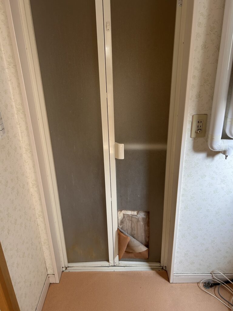 折り戸を正面から見ると、下部のパネルに明らかな損傷があります。段ボールで仮に塞いであるのが見てとれますが、これはあくまで応急処置。早めの修理が必要な状態です。