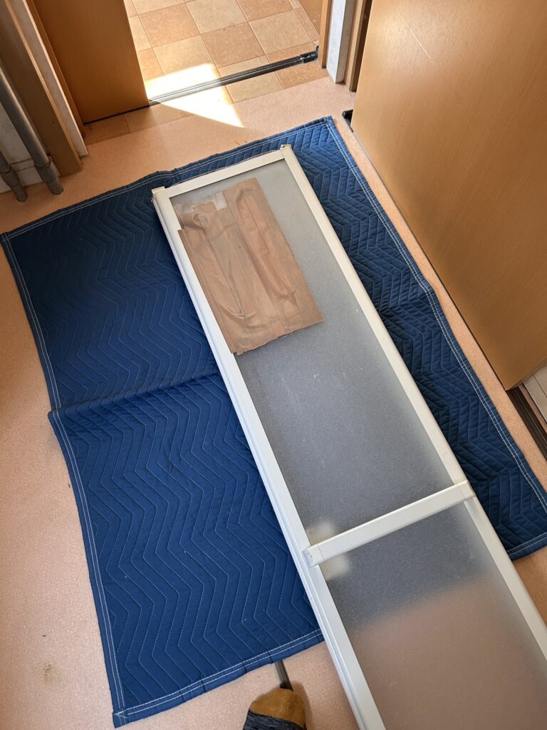 まず折り戸全体をレールから外して、養生マットの上に寝かせます。折り戸はパネルとフレームで構成されているため、フレームを傷つけないよう慎重に取り外します。