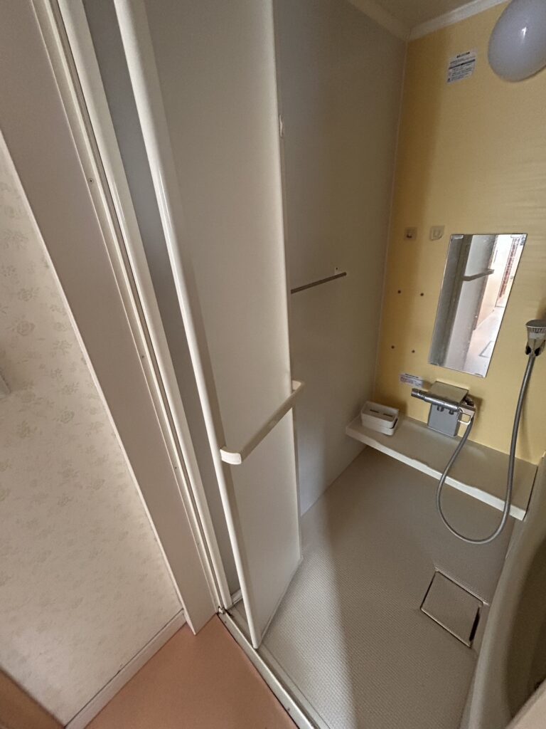 浴室内から見ると、折り戸はユニットバスの入口に設置されており、使い勝手には問題ないように見えても、パネルの破損部分から水気が漏れるリスクがあります。