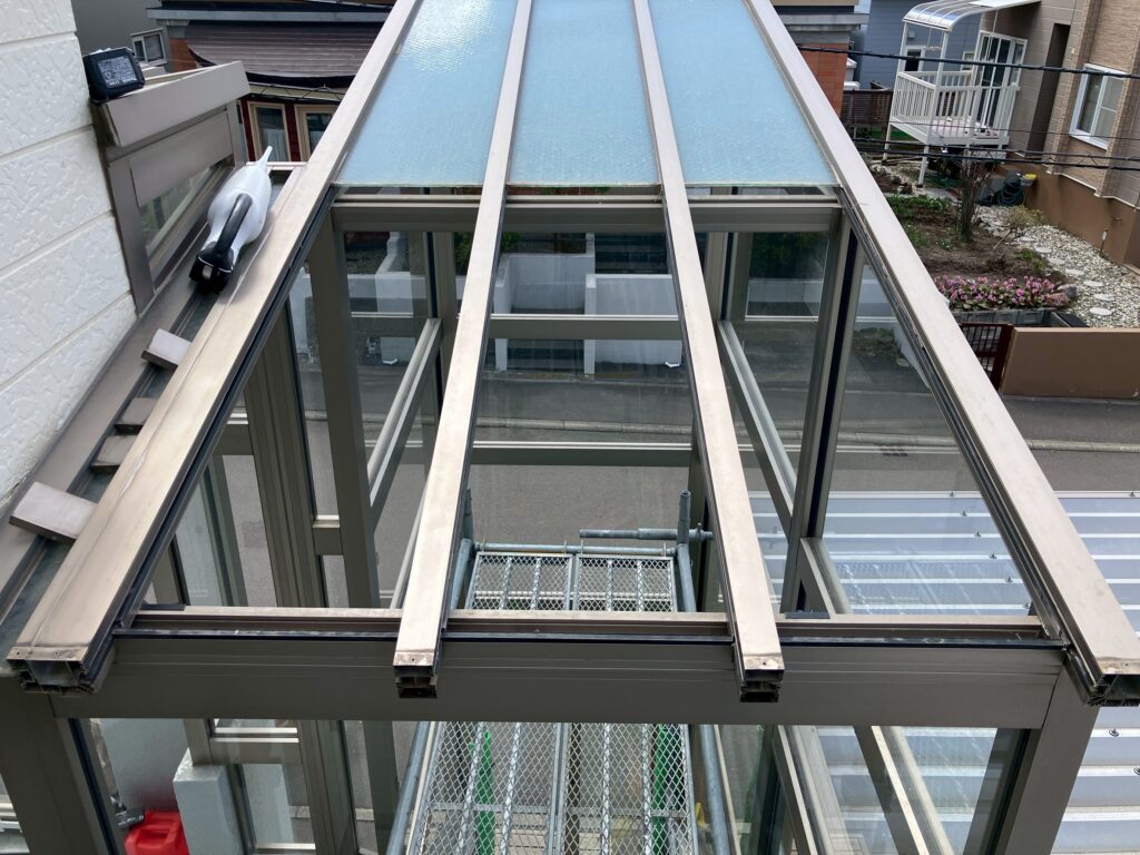 以前のブログ記事「大雪による風除室屋根・カーポートの雪害にご注意ください」でご紹介した風除室屋根の網入りガラスのヒビ割れの修繕工事が、無事に完了しましたのでご報告します。