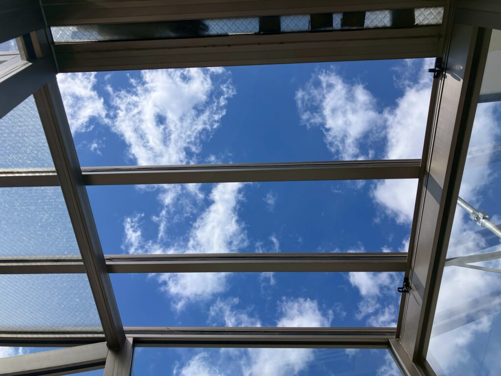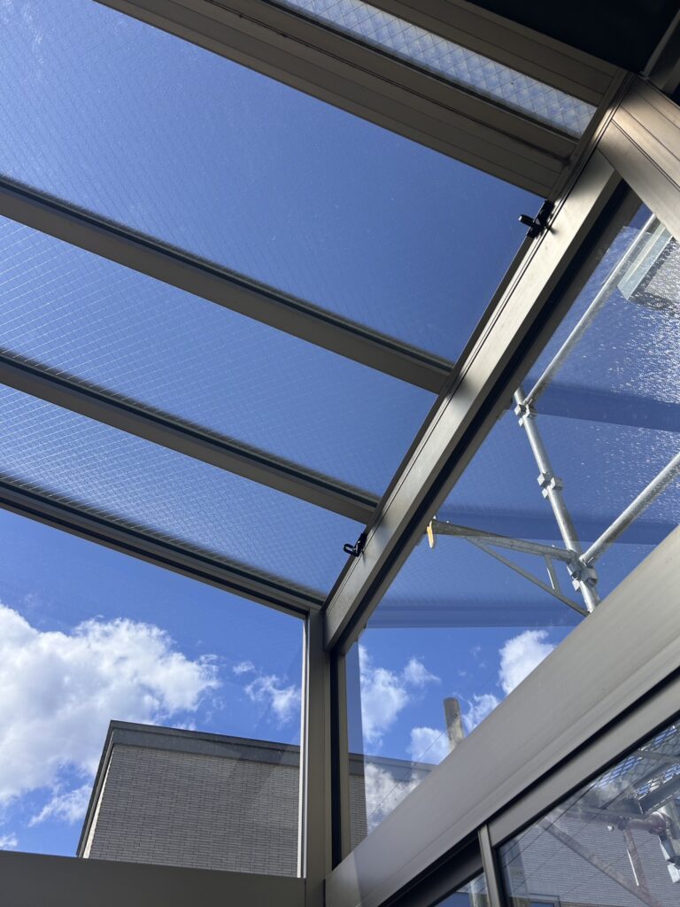 ▲ 室内から見上げると、青空がクリアに見えます。網入りガラスならではの菱形模様が整然と並び、すっきりとした仕上がりです。
