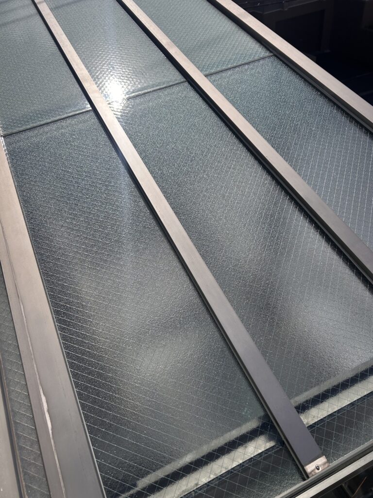 網入りガラスは内部に金属ワイヤーが入っているため、完全な落下は防げましたが、亀裂が入った状態では雨水の浸入リスクもあり、早急な交換が必要な状態でした。