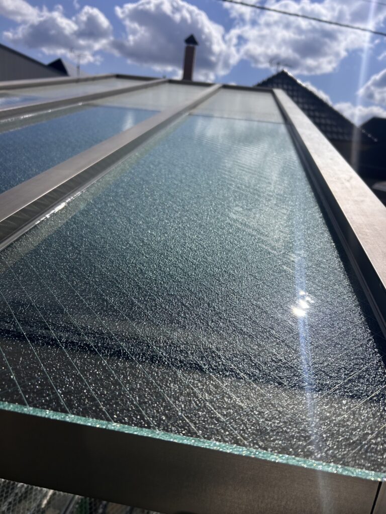 網入りガラスは割れても落下しにくい安全な素材ですが、ヒビが入った状態では雨漏りの原因にもなります。気になる点があれば、早めにご相談ください。